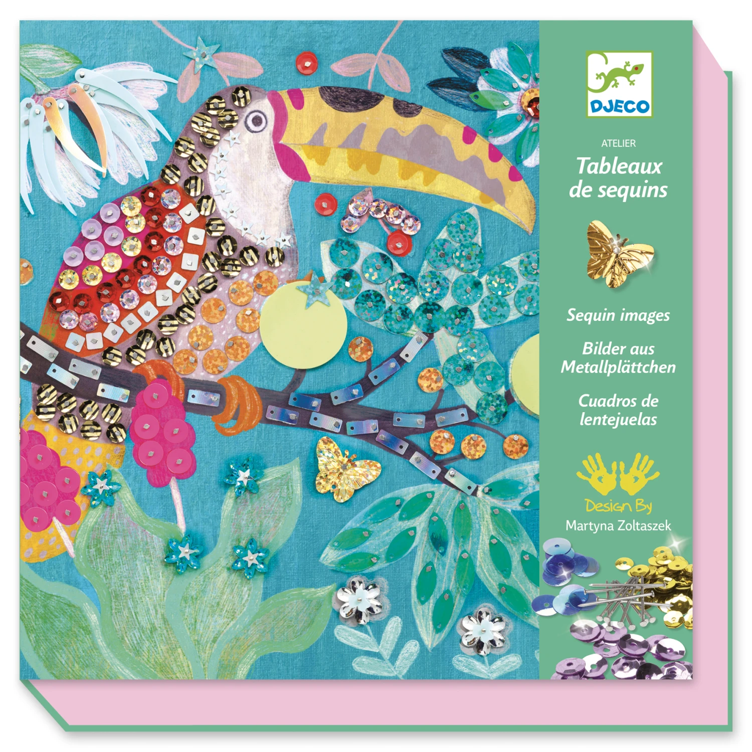 Exotisch knutselpakket van Djeco. Maak 2 schitterende schilderijtjes door de lovertjes met de kleine naaldjes op de gekleurde ondergrond vast te prikken. Volg hierbij de stappen in de bijgeleverde handleiding.