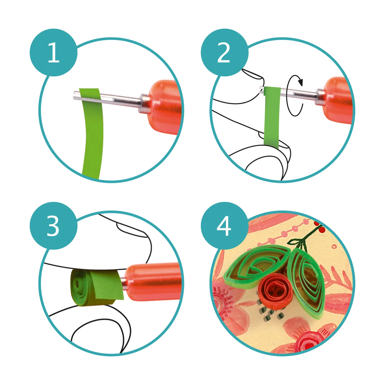 Door strookjes papier op te rollen m.b.v. het sjabloon en het specialeย quillingpennetje kunnen permanentjes, pruiken en andere krullen gemaakt worden.