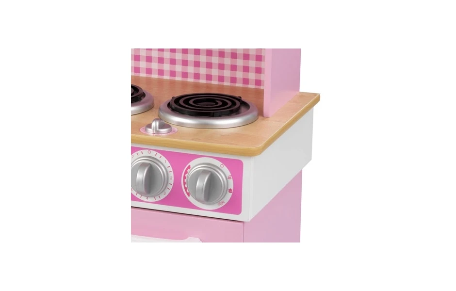 Gezellige houten keuken met nostalgische uitstraling m.n. door het gordijntje onder de gootsteen. Compleet met aanrecht, fornuis, oven en magnetron en grote extra bergruimte onder de keuken.