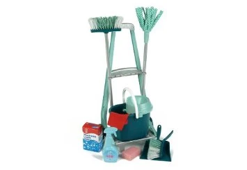Emmer, vloermop, bezem, handveger en blik, dweil, spons en poetsmiddelen.