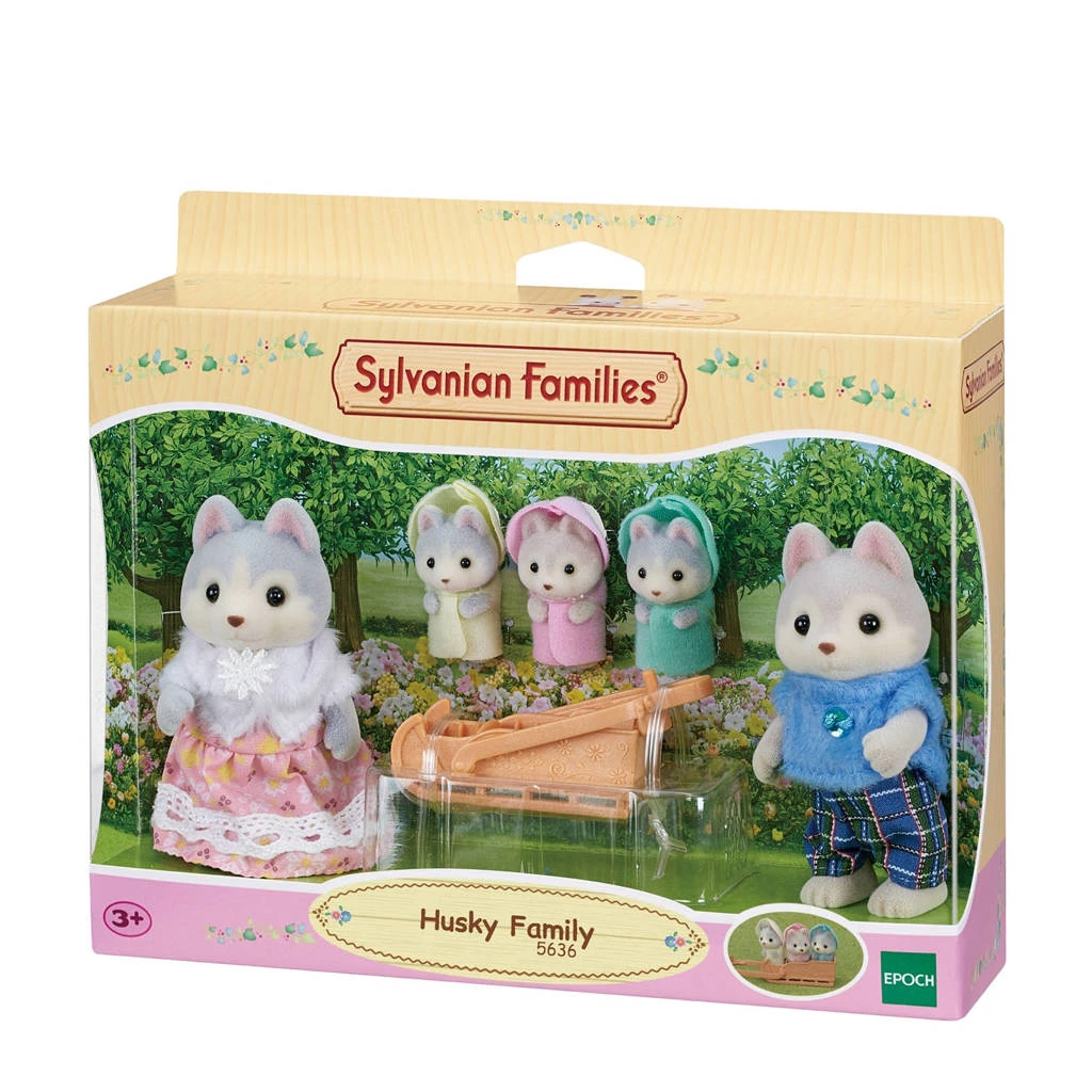 De familie Husky bestaat uit papa, mama en een net geboren drieling Husky in de slee.