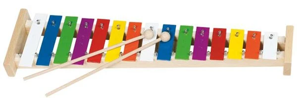 De staafjes resoneren op hun bedje maar kunnen er niet afgehaald worden. Dit klokkenspel met 15 klankstaven heeft een houten klankkast.